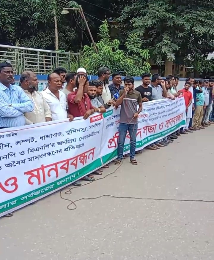 মানিকগঞ্জ জেলা ঘিওর উপজেলা ঘিওর সদর ইউনিয়ন ঘিওর থানা গেটের সামনে। মানববন্ধন ও প্রতিবাদ সভা ৩০ আগস্ট ২০২৫ শনিবার বেলা ১২দিকে মানববন্ধন ও প্রতিবাদ সভায় অংশ নেন। বাংলাদেশ জাতীয়তাবাদী দল বিএনপি সহ বিভিন্ন অঙ্গ সংগঠনের নেতাকর্মীরা ও সাধারণ জনগণ এ সময় উপস্থিত ছিলেন। বাংলাদেশ জাতীয়তাবাদী দল বিএনপি ঘিওর উপজেলা শাখার সভাপতি মীর মানিকুজ্জামান মানিক সাংগঠনিক সম্পাদক মোহাম্মদ জানে আলম জানু স্বেচ্ছাসেবক দলের আহবায়ক মোঃ শওকত আলী সহ বিএনপি বিভিন্ন সহ অঙ্গ সংগঠনের নেতাকর্মীরা বক্তব্য প্রদান করেন। বক্তৃতা প্রদান কালে বক্তারা বলেন আমাদের জন মানুষের নেতা মোহাম্মদ এস এ জিন্নাহ কবির।জনপ্রিয়তা ঈশান্বিত হয়ে। পতিত স্বৈরাচার আওয়ামী লীগের দোসর দখলবাজ খন্দকার বাবলু ভাবমূর্তি ক্ষুন্ন করে মিথ্যা বানোয়াট ও অবৈধ অপপ্রচার চালাচ্ছেন। আমাদের নেতার সম্বন্ধে না জেনে। আজেবাজে মন্তব্য না করে নিজের চেহারা আয়নায় ভালো করে দেখে নিন। আপনারা যে সমস্ত বাজে মন্তব্য করেছেন। তা অবিলম্বে প্রত্যাহার করুন। তা না হলে জনগণ এর দাঁতভাঙ্গা জবাব দিবে। বক্তার আরো বলেন আমাদের নেতা জিন্নাহ সাহেব অত্যন্ত জনপ্রিয় লোক। তিনি তারেক রহমানের হাতকে শক্তিশালী করার লক্ষ্যে তারেক রহমানের ৩১ দফা প্রচার প্রচারণা জন্য বিভিন্ন ইউনিয়ন ওয়াড ও গ্রাম পর্যায় প্রতিনিয়ত ছুটে চলছেন। গরিব দুঃখীর জননেতা মোহাম্মদ এস এ জিন্নাহ কবির। তিনি মানিকগঞ্জ ১ ঘিওর দৌলতপুর শিবালয় নয়ন মনি আমরা তাকে সব সময় সমর্থন দিয়ে যাব। মানিকগঞ্জ ১ আসনের বিএনপি’র গণজোয়ার এস এ জিন্নাহ মাধ্যমে ফিরিয়ে আনব। আপনারা সবাই কারো কোন কথায় কান দিয়ে সবাই একতাবদ্ধ হয়ে থাকার আহ্বান জানার নেতাকর্মীরা। মানববন্ধন ও সমাবেশ শেষে একটি বিক্ষোভ মিছিল বের হয় মিছিলটি ঘিওরের বিভিন্ন গুরুত্বপূর্ণ স্থান প্রদক্ষিণ শেষে ঘিওর বাসস্ট্যান্ড এসে শেষ হয়।