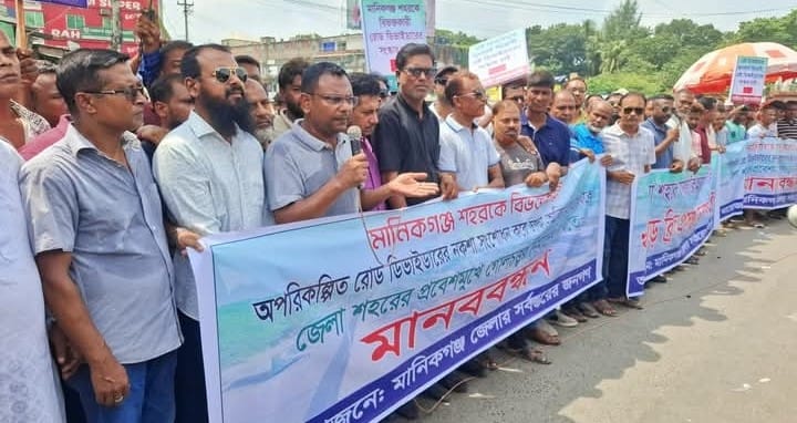 মানিকগঞ্জ জেলা শহরের প্রবেশ মুখে গোল চত্বর ও ফ্লাইওভার দাবিতে মানববন্ধন পালিত।