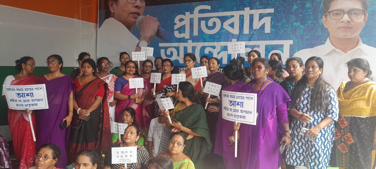 আজ ৯ই সেপ্টেম্বর মঙ্গলবার, ঠিক দুপুর দুটোয়, ধর্মতলা ডরিনা ক্রসিং এ অঙ্গনওয়াড়ী ও আশা কর্মীদের যৌথ উদ্যোগে বাংলা ভাষার বিরুদ্ধে প্রতিবাদ জানালেন।