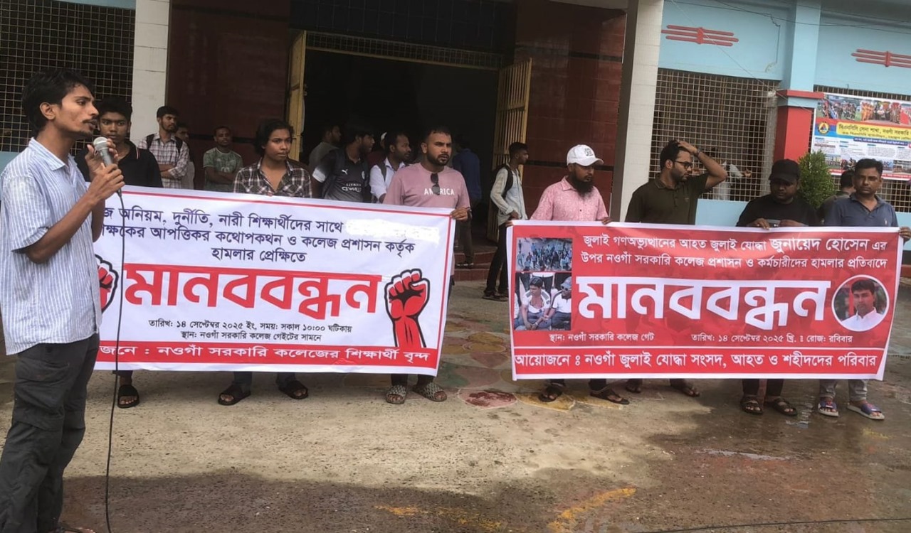 নওগাঁ সরকারী কলেজে অনিয়ম, দূর্নীতি, নারী শিক্ষার্থী (ছাত্রীদের) সাথে অধ্যক্ষের আপত্তিকর কথোপকথন ও কলেজ প্রশাসন কর্তৃক হামলার প্রতিবাদে মানববন্ধন কর্মসূচি পালিত হয়েছে। রবিবার বেলা ১১ টায় নওগাঁ সরকারী কলেজ চত্বরে কলেজের শিক্ষার্থী ও জুলাই যোদ্ধা সংসদ, আহত ও শহীদদের পরিবারের ব্যানারে ঘন্টাব্যাপী এ কর্মসূচী পালিত হয়। জানা যায়, কলেজের ছাত্রীদের ম্যাসেনজারে আপত্তিকর মেসেজ পাঠানোসহ অবৈধ সম্পর্কে জড়াতে চাপ প্রয়োগের অভিযোগ উঠেছে অধ্যক্ষ প্রফেসর সামসুল হকের বিরুদ্ধে। সম্প্রতি এ-সংক্রান্ত বিভিন্ন স্ক্রিনশট সামাজিক যোগাযোগ মাধ্যমে ছড়িয়ে পড়েছে। যেখানে ছাত্রীদের ওড়না ছাড়াসহ বিভিন্ন সাজে দেখার আবদার করেন তিনি। বিষয়টি যাচাই সাপেক্ষে অভিযুক্তের বিরুদ্ধে শাস্তিমূলক ব্যবস্থা নেওয়ার দাবী জানানো হয়েছে। ছাত্রীদের সাথে অশোভন আচরণ করায় ফুসে উঠেছে সাধারণ শিক্ষার্থীরা।