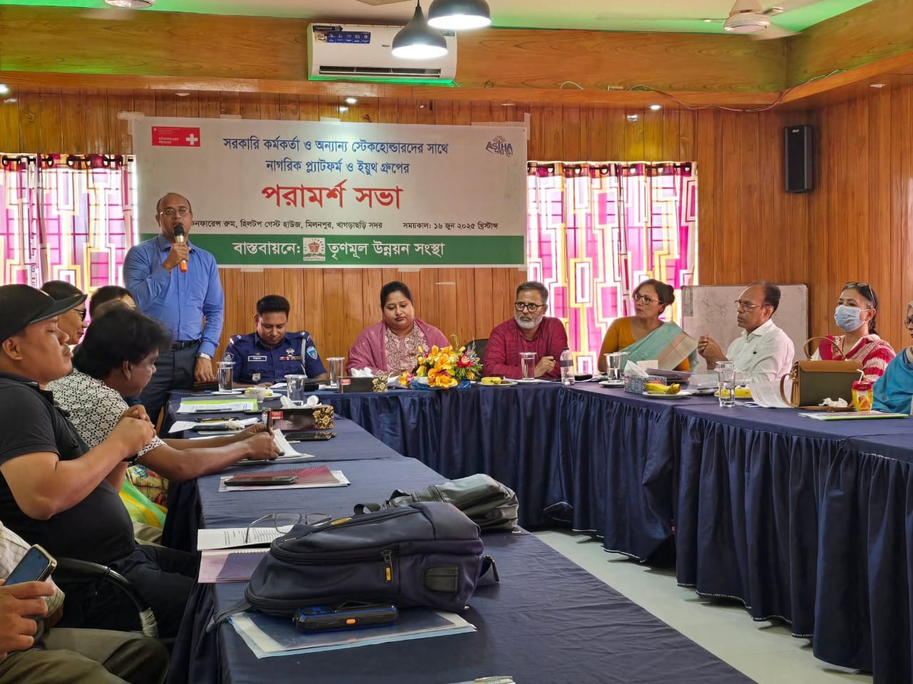খাগড়াছড়ি জেলা সদরের মিলনপুরে হোটেল হিল টপ গেস্ট হাউজের কনফারেন্স রুমে সরকারি কর্মকর্তা ও অন্যান্য স্টেকহোল্ডারদের সাথে নাগরিক প্ল্যাটফর্ম ও