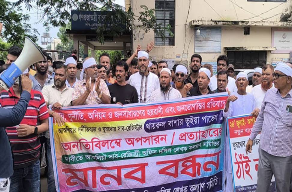 আশুলিয়া সাব-রেজিস্ট্রারকে অপসারণের দাবিতে কাফনের কাপড় বেঁধে বিক্ষোভ